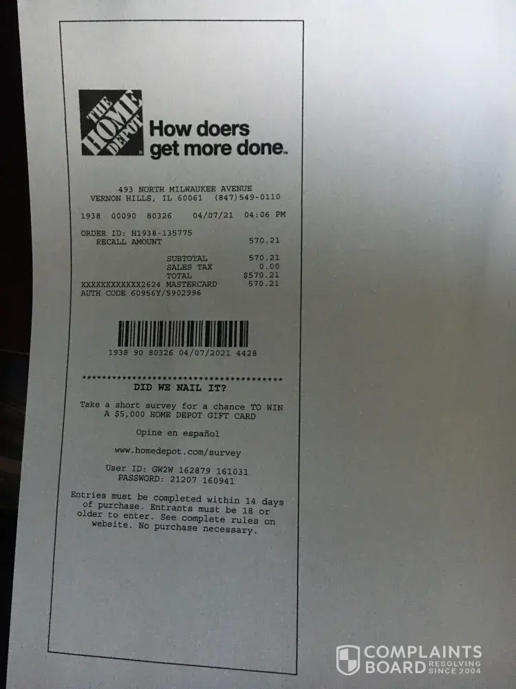 Desired outcome: Someone from Home Depot customer service contacting me or my wife whit and explanation