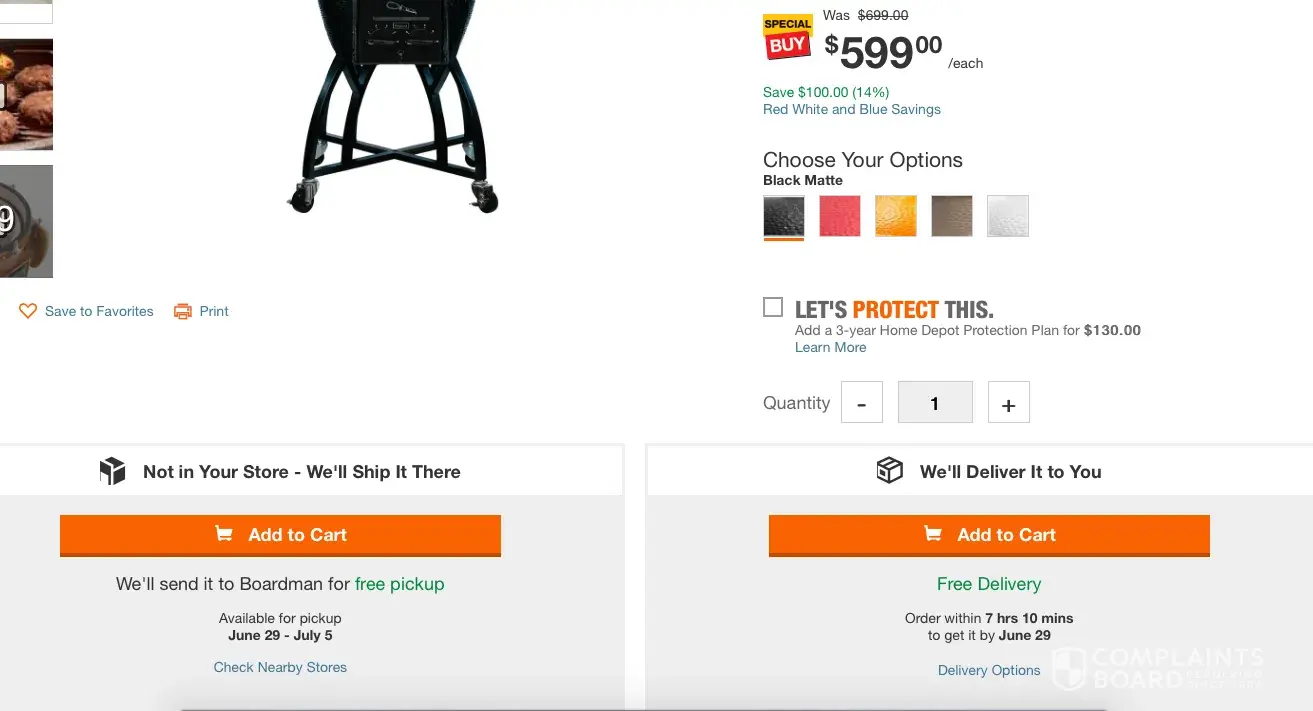 Home depot.com Home depot is pushing to buy things online with offers to "buy within the next 2 hrs, and get it by a certain date. Their delivery times are not possible with the way they contract trucking companies. They know this when they are asking you to pay in GOOD FAITH that its not possible. As it stands today, they ship to multiple locations, where your item stays for days till a truck is full then they ship it to another location and start the process again. I ordered a grill on June 25 for the 4th of July... and PAID within the next 2 hrs to get delivery by June 29, they shipped it from MO to Akron Ohio on the 26th. I live 45 min from Akron. Then its shipped to Cleveland where it is still sitting on the 30th its been there 1.5 hrs from my house since the 27. They company Home Depot contracted say its sitting in their terminal and has been for days. They are closed till Monday and they have "more freight than drivers", direct quote, so who knows. I can check back Monday as they are closed over the weekend. Home Depot tells me I may get it by July 9th...