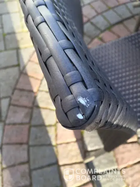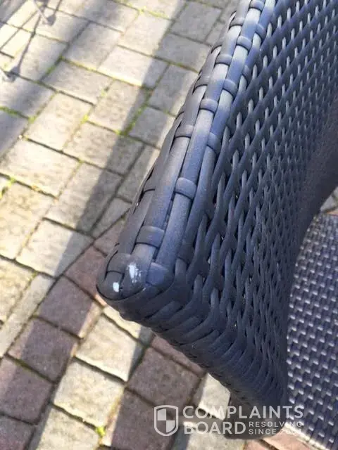 The table had a piece of film missing and they put a piece of tape over it but it should have been exchanged for a new table top. We purchased it new and it came in like a second hand piece. Home Depot's solution was to send us paint to fix the problem. Two of the chairs had damage on them and again the solution was to send paint.