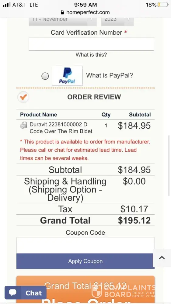 Home Perfect has received 9 complaints on ComplaintsBoard. The first reported case, Delivered damaged sink, was published on Oct 29, 2010, and the most recent complaint, Kohler toilet bowl, was posted on Feb 1, 2022.