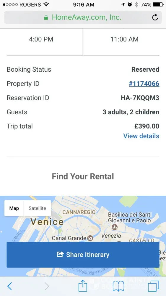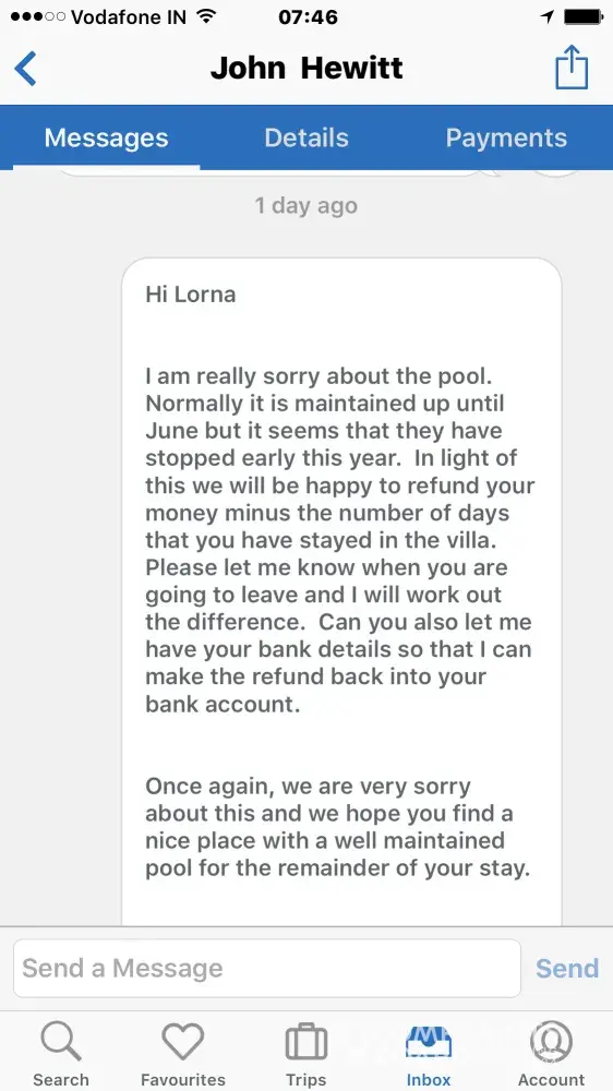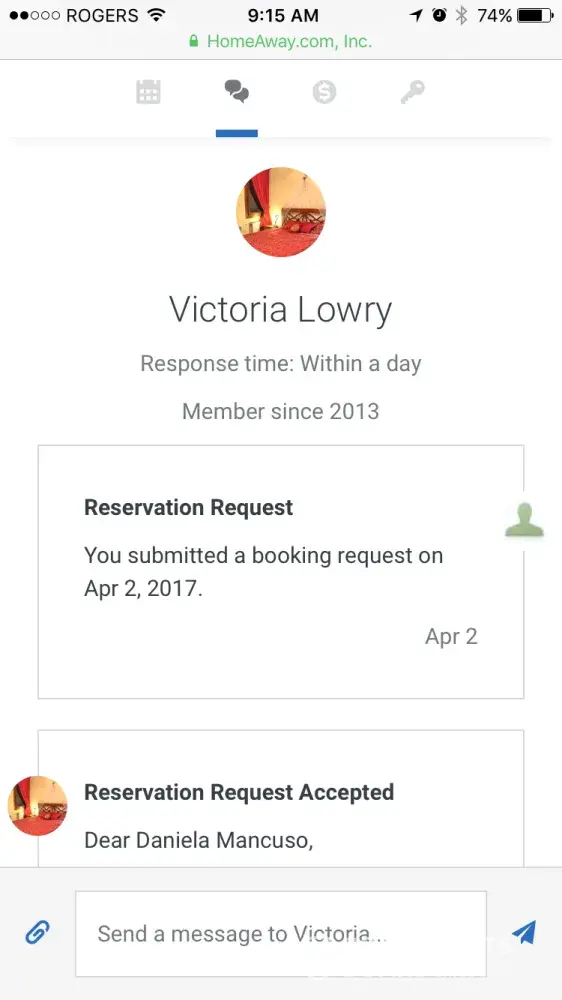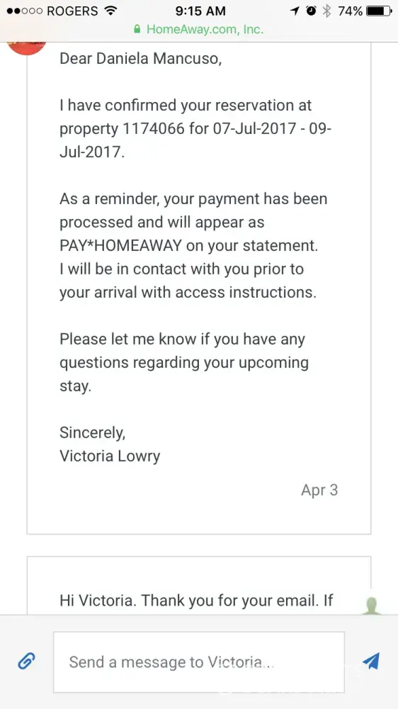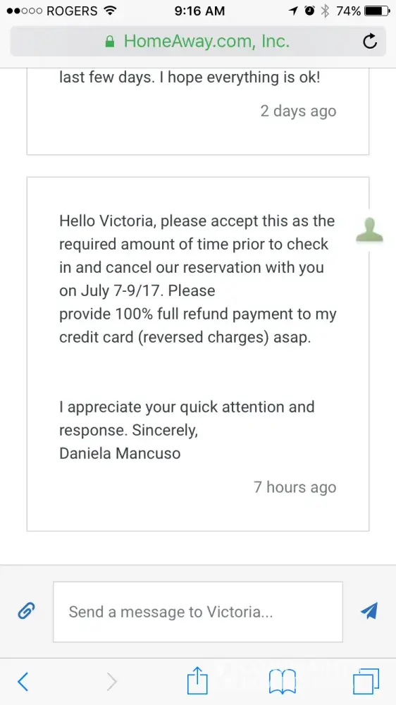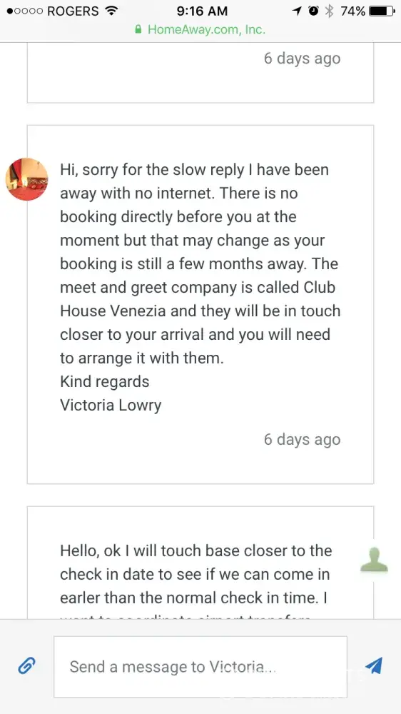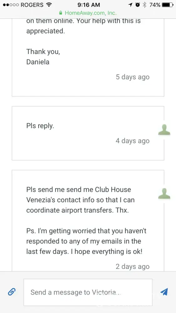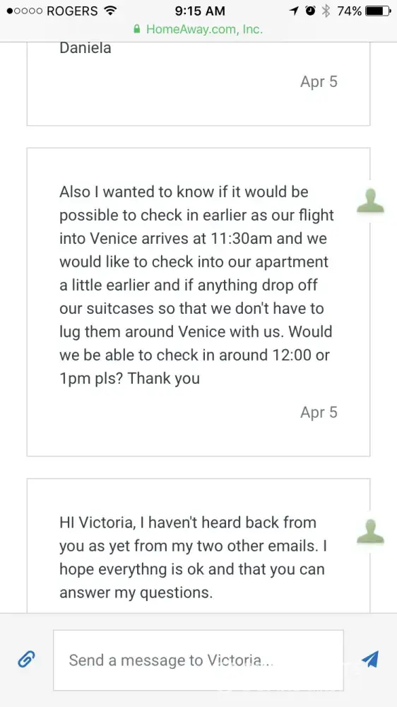 I also want to make note that I had contacted HomeAway via email asking for help with this and all I was given was Victoria's phone number. I emailed HomeAway back stating that I live in Canada and did not want to incur the long-distance charges to the property owner in Europe. They responded with the same answer that I needed to contact the property owner so therefore I called home away this morning and went through the whole story again asking that my refund be sent to me in the property be cancelled ASAP. I would hope that in future homeaway would be of better service to renters and and being that this is the second instance noted of travellers having a problem with this property owner in communication with her maybe her profile needs to be looked at and reassessed.