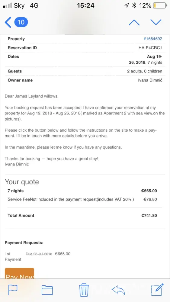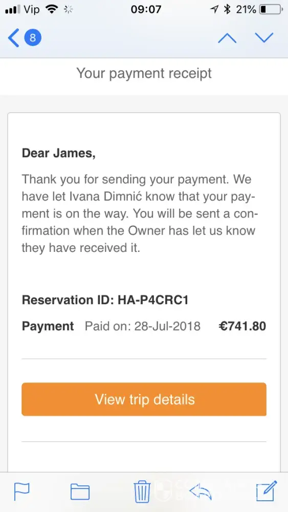 I have attached the booking nunber and payment details for my reservation. I recently booked through yourselves for an apartment, after using my credit card to pay and have confirmation thanking for my payment of 741.80 I then was told on my last day that I had not in fact paid, so ended up having a stressful final day having to borrow and transfer money in under an hour so we didn't miss our flight in order to pay the owner, this is not her fault and the issue is with you, because we have had to transfer money we have been charged so I am going to calculate the charges and have yourselves pay these and compensation for a nightmare end to the holiday which up till that moment was amazing, I would like a contact email address to send to you directly my charges etc