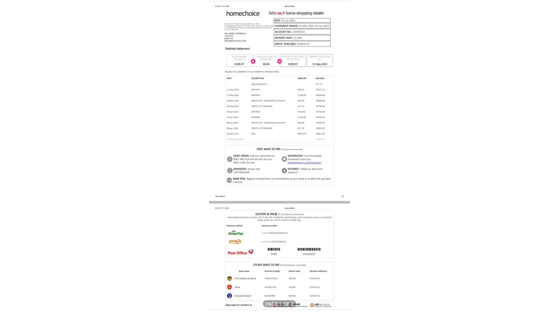 On the 01 March 2023, I have ordered a set of pots at Homechoice at an amount of R3707.22. installment of R197.88 X 24 months. After I made 2 payments, they are saying my account is on arears because I should R258.97 instead of R197.88. I trouble to understand because I took the pots because I cab afford to pay the intially installments. The situation is stressing and affecting my credit scores. Homechoice is taking advantage of me and I have been a they are customer for years. I even went to the Homechoice store at Struben Street, here in Pretoria to lounge the query but I was not assisted. The manager is saying the account was changed due to interest rate and the explanation did not make sense to me.