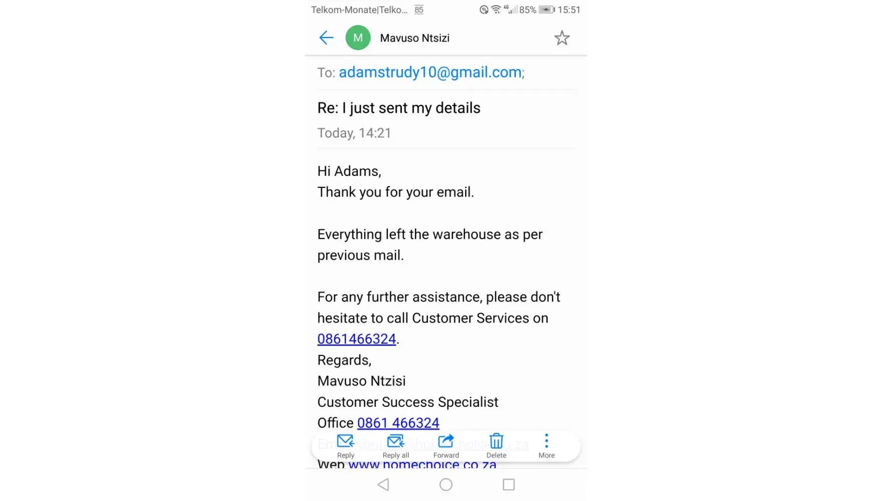 I think homechoice has very very bad customer service.. I'm waiting on my order from the 28th of June and nobody has called me to say where it is.. My mailbox is full of all the emails that I have received the same thing over and over again..