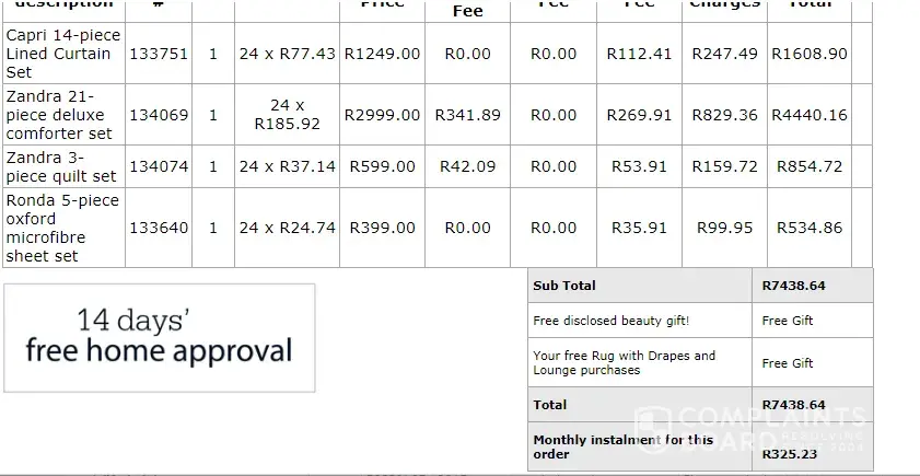 Attached to this complaint is the order form, which states that I ordered the items over 24 months at R325.23 p/m. I don't understand why my statement is almost double that amount.