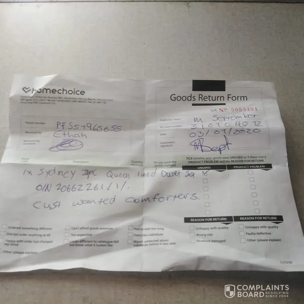 I ordered duvet set in January. I received an SMS to nofy that the goods were still in the ware how, after that I never received ant SMS for dispatched products. When I called home choice I was told that the items were received and signed for. I never received those things please help as I am stressed because of this carelessness my ID Number is [protected] or call [protected]