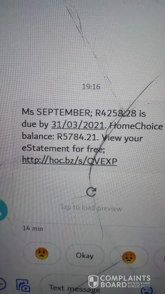 Now, almost a year later she still receive sms' of demand. This after we have spoken to numerous of Home Choice's consultants