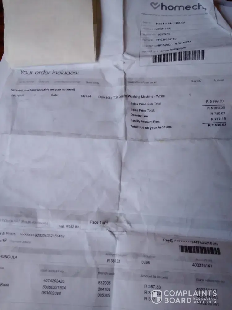 I bought the washing machine on the 23-03-2020 my monthly payment was R387 for 16 months period. Every month I'm paying nothing less then R400 . Homechoice are phoning everyday saying I'm behind with my payments which I don't understand. According to homechoice I should be paying for 24 months period which is not what we agreed on even my statement that came with the washing machine state that my overall amount due is R7535.03. You know you wrong but I'm the one who have use my airtime over and over again about the samething. For the last time do the right thing . This is the statement that came with the washing machine, stop telling me about your system.