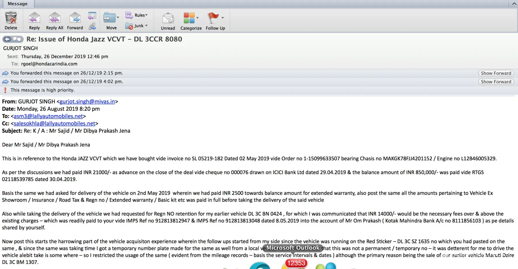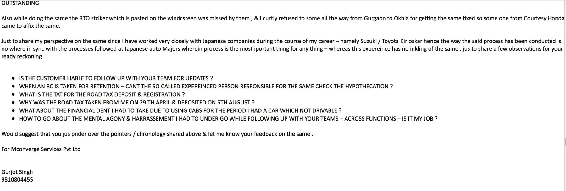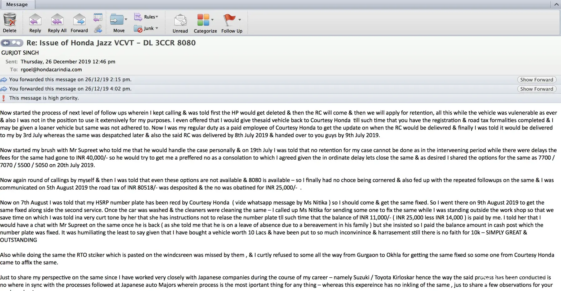 Please find below mail I sent on 16th November 2019 to Honda India: