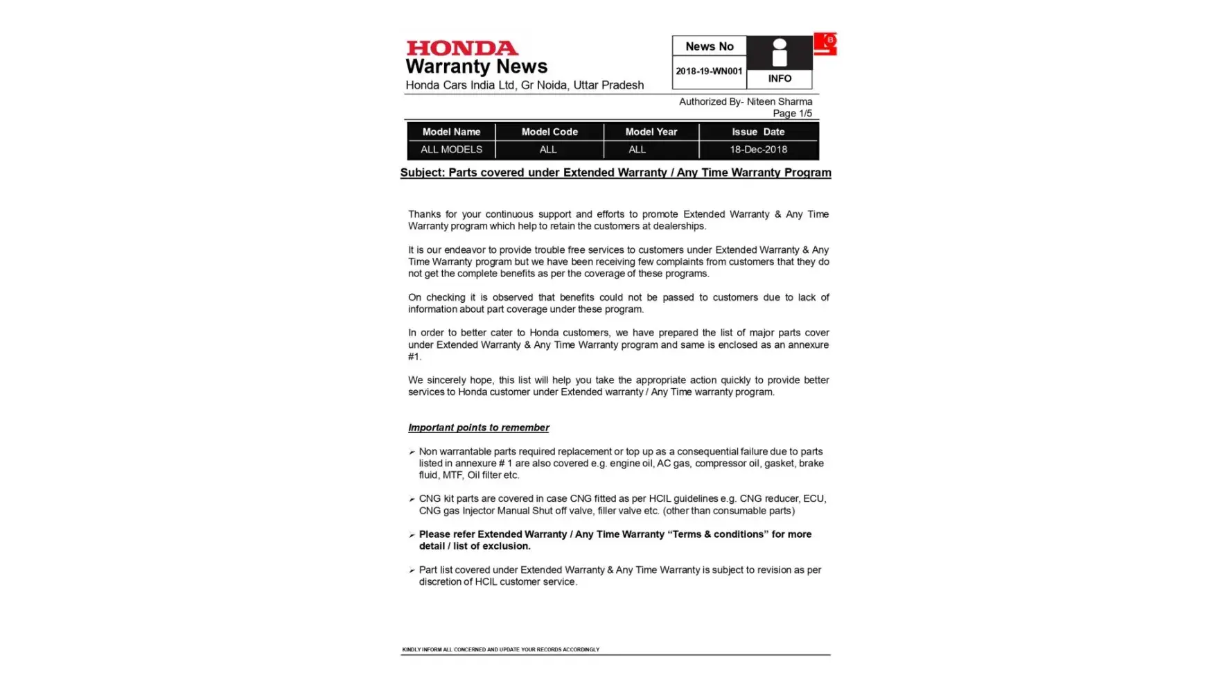 Honda Cars India Honda cars not honoring their sold extended warranty of honda city car nor replying the querry in writing