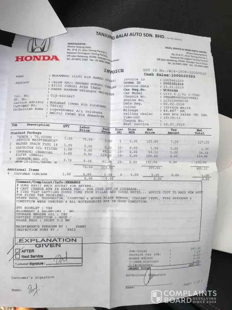 My mileage during service for 70, 000 KM is 46, 467 KM(mileage before 36, 000 KM) as my car already reached 10, 000 KM schedule (10, 000 KM or 6 months) whichever comes first. As my service package stated, for service 70, 000 KM, there is no labor fee. However, when I arrived at service centre, service advisor include labor fee in my invoice. I have to pay because my car need to be service. The service advisor did give explanation, the reason I need to pay for labor fee is because I service my car too early.