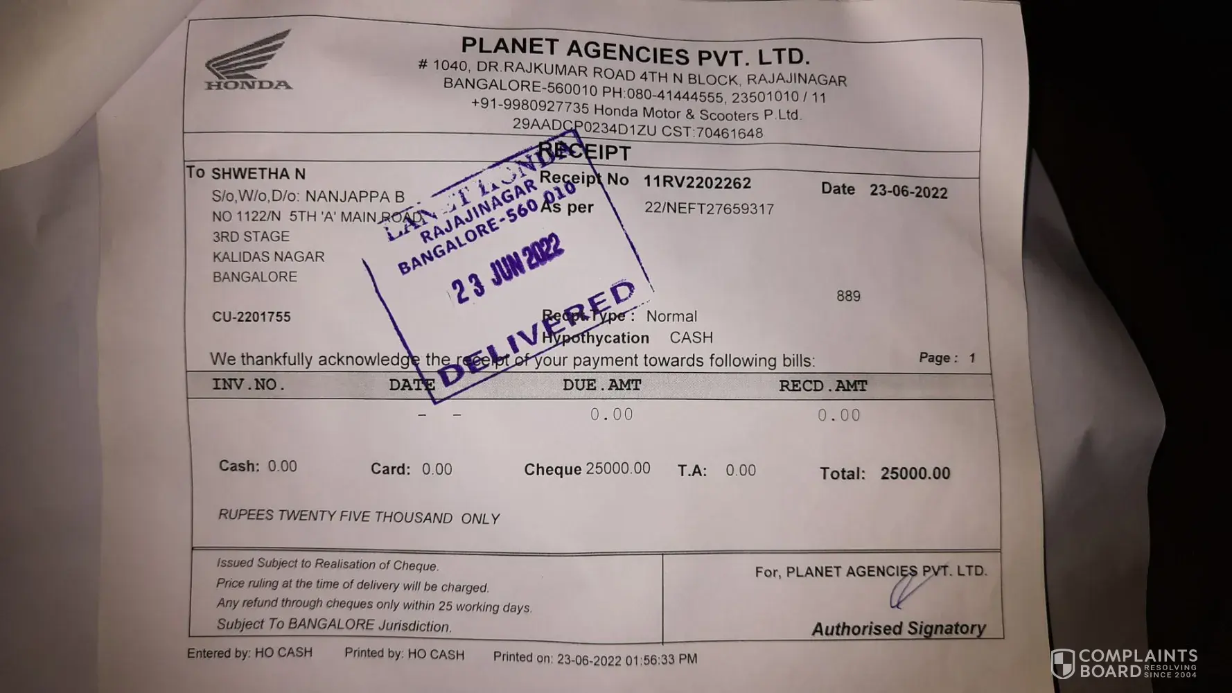 I have made repeated attempts to escalate this matter to both the showroom and the customer care department of the Honda company. However, the showroom personnel simply ignore my concerns, and the customer care representatives only assure me that my complaint has been registered without providing any resolution. To date, I have not received any response from the company regarding my complaint.