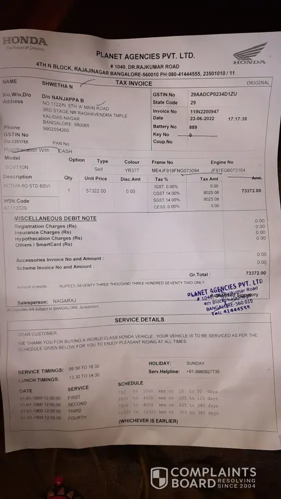 I have purchased activa 6g metallic copper color from rajajinagar, bangalore planet honda on 23.6.2022 I just got invoice still the vehical is nt registered yet n also I didnt get my insurance copy the vehical is defective it is getting excess heat in left n right running board which I couldn't drive I just drive only 15 kilometers totally I felt burning in my both the legs I want my refund back are I ll put a case in consumer court I m also attaching my invoice and photo of vehical where it is getting heated up. and also has they have given defective vehicle cover I have attached all the images