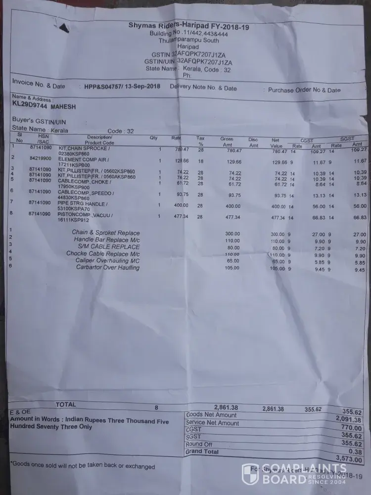 my honda unicorn vehicle (KL 29D 9744) was serviced @ Shymas honda harippad branch(haripad, kerala, pin code - 690514) on 13 September 2018. I'm not satisfied with the service at all. Huge bill amounts & labour charges. its extremely high.very poor behaviour & attitude from the service manager mr.shibu lal. also he doesn't care about the service quality & timings. also there is no inverter or any other alternative way for power loss. water service is also not done due to lack of electricity. very poor atmosphere. These are a great disadvantages for a reputed company like honda two-wheelers india ltd. so take seriously
