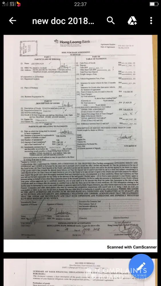 My car agreement letter since jun'18 until now still never receive it. I had called the officer (his name mr wong contact number is [protected]) & check him about the status. He told me that i'm not the only one customer did not receive letter, some others customer also facing the same problem, he has sent email to hq kl branch chase them to resend the mailing (I just wondering agreement letter is under private confidential why not alert mail send us to go post office to collect?), he said he didn't get response from hq office. Few days later I check with the officer for status, but he asked me go any hong leong bank branch request with counter officer send the letter to the nearest hong leong bank branch instead of send to my mailing address. Why must get us in this troublesome? My car plate number jsu6791. Car owner is lee han hua. Can you solve the problem for me? This is my 2nd time using hong leong bank car loan. I didnt know why the letter can drag for so long without inform us anything until... We asked. As attached pdf file which I received from mr wong by whatsapp.