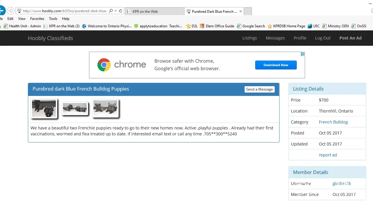 October 6 saw an add for French Bulldog puppies for sale. Upon contacting the breeder they noted they are out of town for the weekend and have had a number of enquiries. If we sent a deposit, they would hold the female puppy for us and we would pick up on Tuesday when they are home. Confirmed Tuesday prior to making the 2.5 hour drive, we were still on. Yes was the answer. When we arrived at the address provided it was a home up for lease. No one has lived there since July. Of course no puppy. When I called, they stated they were having a bad day (large speeding ticket) but on route was an hour away. 2 hours later still no pup. No further communication by phone or text was answered.