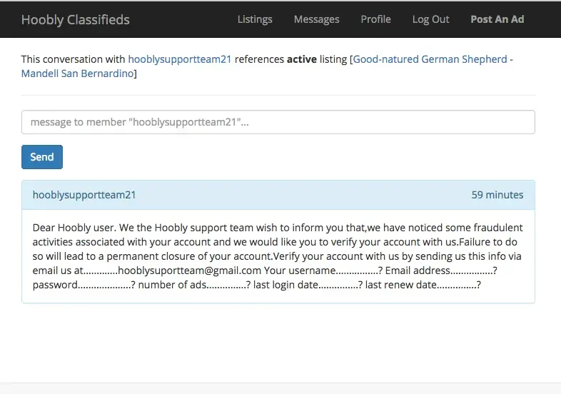 Dear Hoobly user. We the Hoobly support team wish to inform you that, we have noticed some fraudulent activities associated with your account and we would like you to verify your account with us.Failure to do so will lead to a permanent closure of your account.Verify your account with us by sending us this info via email us at...[protected]@gmail.com Your username...? Email address...? password...? number of ads...? last login date...? last renew date...?