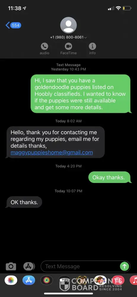 I emailed a breeder in Greensboro NC under the email maggypuppieshome.com. She said she had just sold the puppy we were interested in and that the guy that bought them was changing jobs and needed to find them a home. So she gave me his contact information [protected]@gmail.com. I contacted him and decided to send him the amount we agreed on. He said the puppy would be shipped Monday 2-13-17. Then Monday he said he had to get his papers done so he could be shipped to my airport. Would be here Tuesday. No puppy. Would not give me any information on who he would be coming in on and who the shipper was. I finally got out from him delta pet out of Lancaster PA. I did some checking on my end and Delta does not fly out of Lancaster PA, they fly out of Harrisburg PA. On Wednesday 2-15 he gave me a air bill number for the puppy. I called Delta and the number was invalid. Then around 12 the shipper called me and said the puppy was on his way. The shipper's phone number is [protected]. After i pushed him on Thursday about my puppy, he stopped returning my emails and calls. I have started the criminal fraud case against him and the breeder. DO NOT SEND ANY MONEY TO THESE CROOKS.
