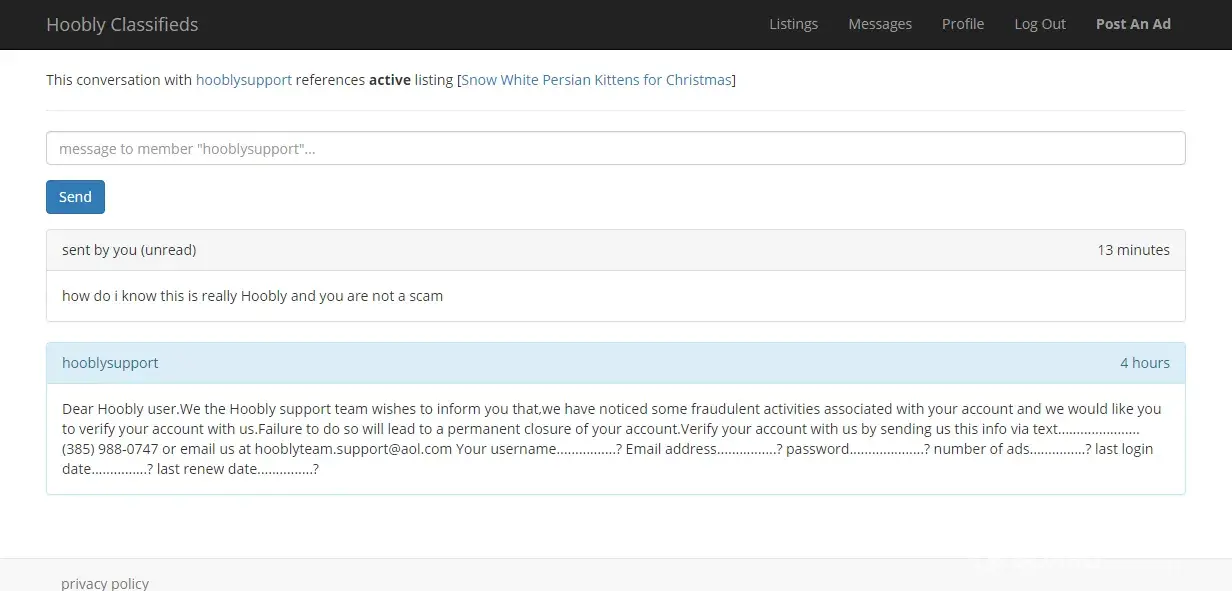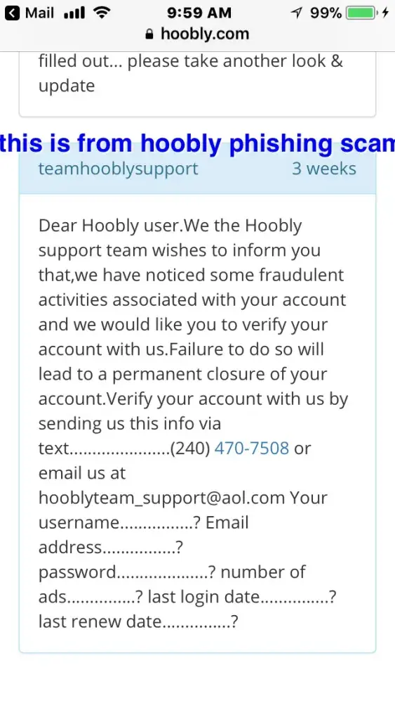 Hello - i have recieved 2 series of phishing messages from fake hoobly support profiles. One is called “hooblysupportteam100” and the other one is called “teamHooblysupport” both ask me for my name email address when I opened my account what my email password is etc. they use an AOL email for me to respond to and provided me with a text number that when I called with a blocked voicemail appears to have come from some texting app online ... Never ever Will any website support team ask you for your email address or password-they can go in through their administrative controls and see what it is for themselves they don’t need you to tell them ! Contact the FCC to complain about this and provide screenshots and links to the peoples fake Hoobly accounts. You can Google FCC complaint and find their complaint form and email address .