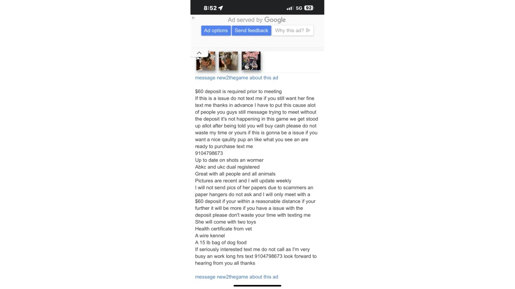 Newtothegame scamed me and another person already useing this sight selling dogs and ear crops