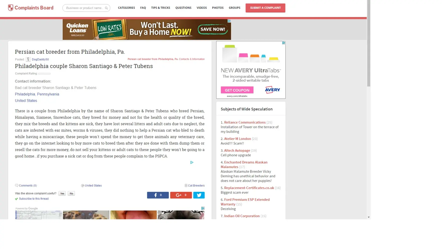 You don't know about the White English Bull Terrier that hung himself after jumping the fence you weren't there, you don't know about the Persian cat that bled to death while having a miscarriage you weren't there, Peter admit that it happen and found the cat dead under his bed he didn't get the cat any medical help even though he seen her covered in blood while she was alive, you don't know about the litter of kittens that died, you don't know that Sharon & Peter sold Persian cats that was infested with ear mites, Sharon & Peter breed for greed, I have witness this myself so don't tell me this is not true, I have spoken to other people who bought cats from Sharon & Peter in the past and there cats were sick...there is so much more about Sharon Santiago & Peter Tubens that you are not aware of, you don't know the whole story, and if you found this post you must have been looking...I know all about ZOZO I have a picture of her, I'm glad she is out of Sharon & Peter house all together.