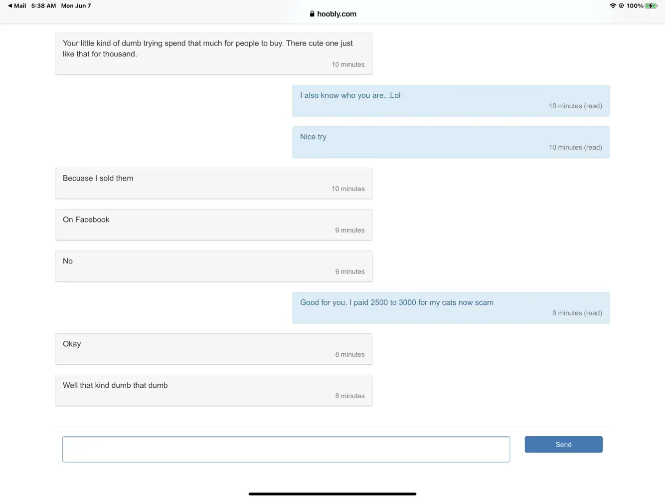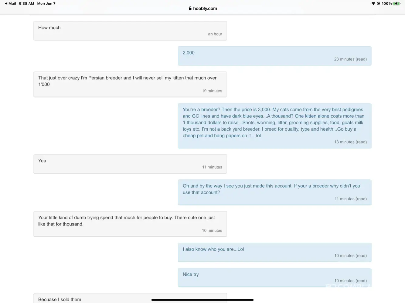 I am being harassed by a potential buyer on your website. They are very rude. ilovepersiancat's They keep calling me dumb. They are nasty. They texted me at 5 this morning and from the very start they didn't act friendly at all. The first thing they said was HOW MUCH. This in itself is suspicious and very rude behavior. I never had anyone talk to me like this...