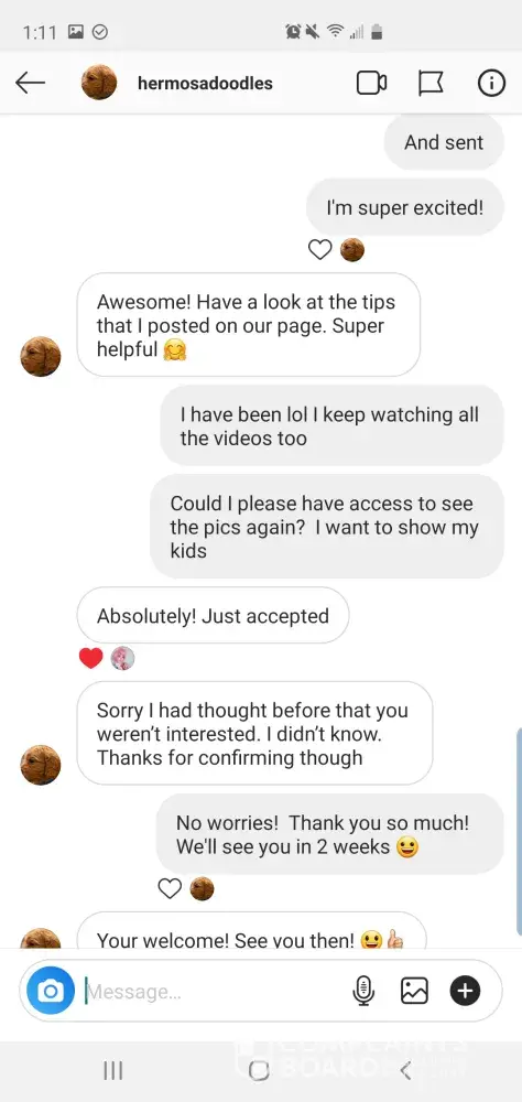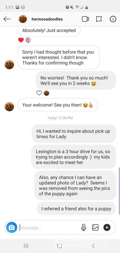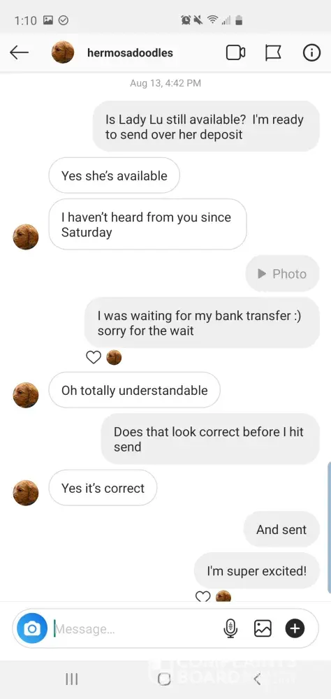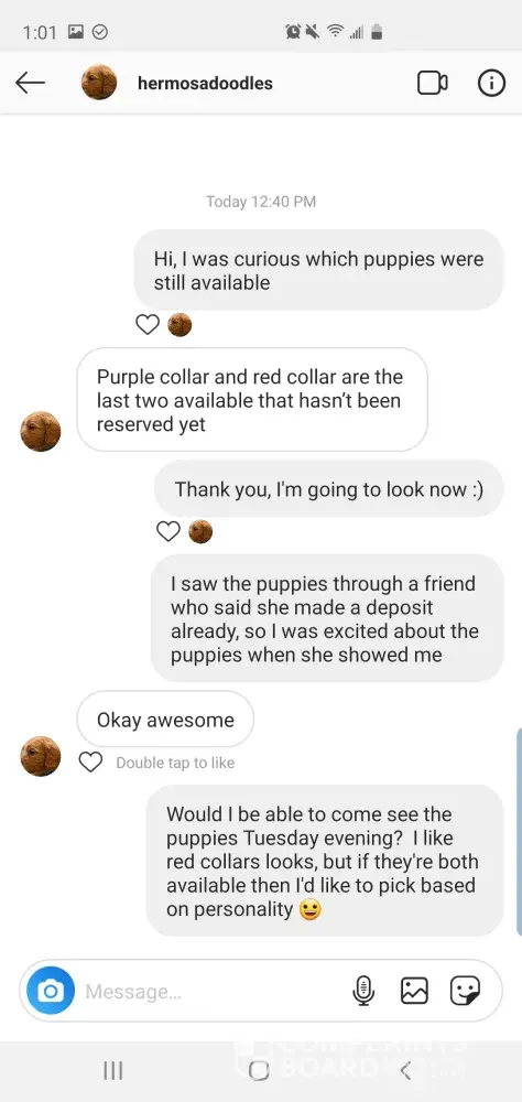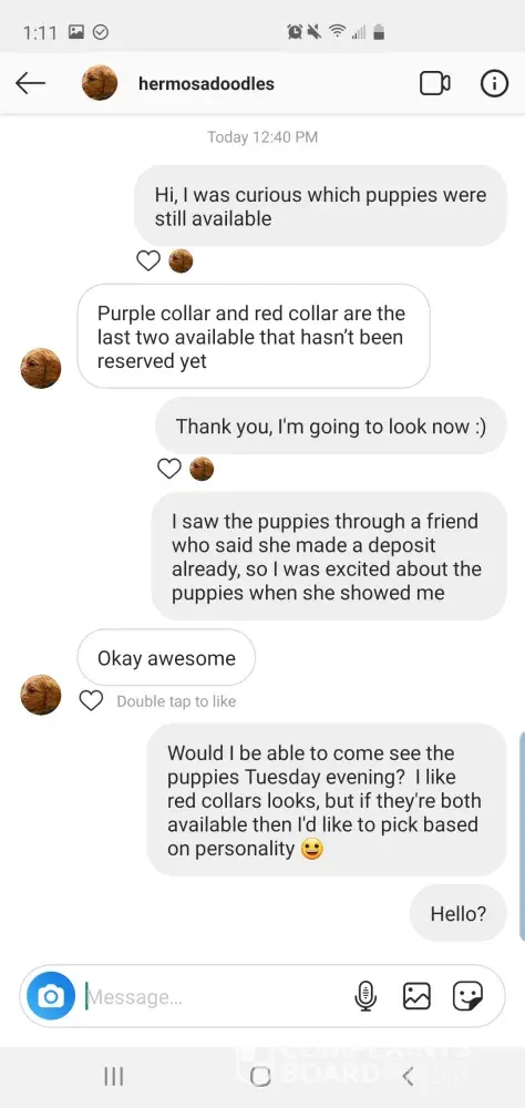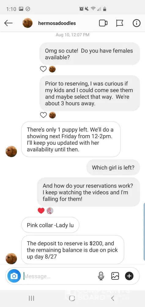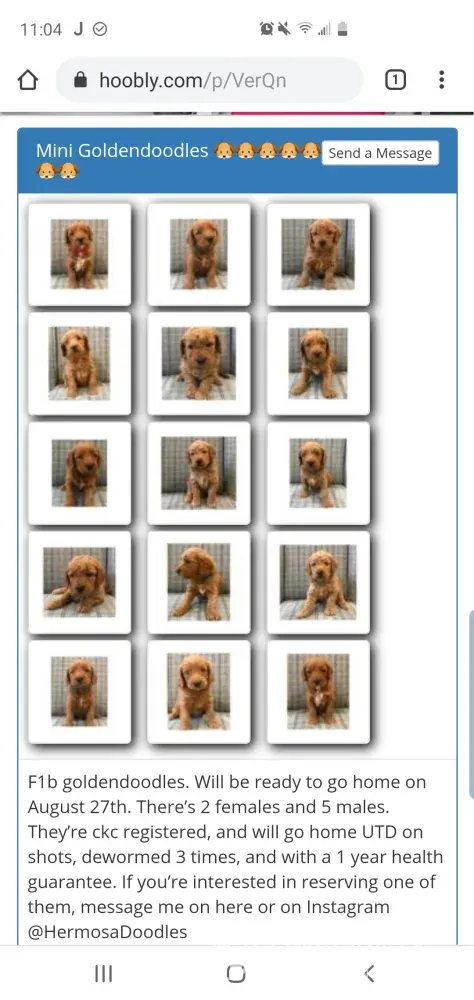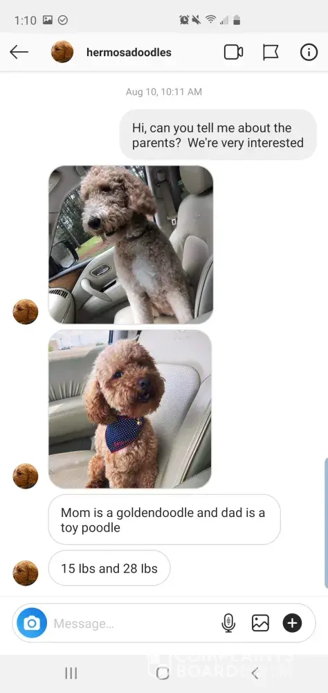 Avoid Hermosadoodles, and the seller in these screenshots on Hoobly. She will take your deposit, then block you. Thankfully I used my credit card through Zelle, so I have buyer protection and am getting my money back.