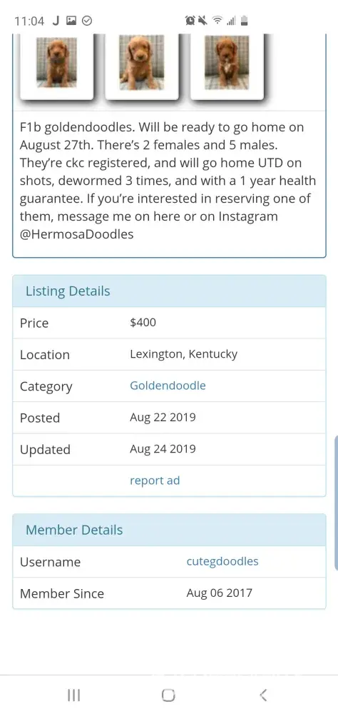 cutegdoodles has put new ads back up this week. She scammed me out of my puppy deposit on September 25. Also if you look it up others are claiming to be scammed. This person should be banned and charged. I have a claim already started against her with my back to try to get my money back. She goes under these names and I'm sure there are going to be more. cutegdoodles on hobbly. On Instagram Crave Frechies, YourFavDoodles, Hermosa Doodles, Desirees Doodles, MoreFrenchBulldogs. Her emails that I have collected are desireesayora@gmail.com, dupreedesiree40@gmail.com, dedut1986@gmail.com. I will not stop tracking her. I will keep trying to warn everyone I can.