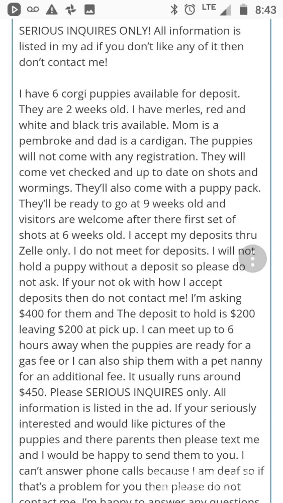 Some red flags that I shouldn't have ignored: (1) Sought after breeds of puppies are priced cheaply enough that they are very tempting but they are not registered so it seems possible. These puppies are far from the age to be weaned, only about 2 weeks old at the time of the ad. (2) She demands a deposit through Zelle or PayPal Friends and Family ONLY and says she will not accept deposits in person. When I had trouble using Zelle she was quick to say that she was sorry I wasted my time and wished me luck on my search, giving me a further sense that we were about to lose our chance for the puppy. (3) She says that you will be welcome to visit the puppies only after they've had their first shots. Understandable from a health perspective but a red flag nonetheless. Weeks go by from planning deposit to this supposed chance to actually see your puppy. (4) She will not accept phone calls, in my case claiming that she is deaf (what a low down lie). This is actually because she uses a free text app to make all those phone numbers. (5) She is very quick to say "if you don't like this don't bother contacting me, " which gives the buyer a sense of urgency in following her demands so as not to miss the great deal on a puppy. (6) She uses misspellings of "your" for "you're" in every ad I've seen. A common mistake but it is such a consistent misuse that it may give a clue that a posting is by her. (7) She continually emphasizes "SERIOUS INQUIRIES ONLY or don't bother contacting me." Many actual animal breeders are enthusiastic about their breed and happy to answer questions. This emphasis on being serious makes the buyer feel like they are already committed to saying they will send a deposit even before contacting her. (8) Upon request she sends beautiful photos of ideal looking puppies posed "just so." She is quick to supply these, they appear almost professionally done and she has age progressions that seem legitimate. Who knows where she gets these images of whole litters different ages from! They were shared through an app called TextMe rather than through her personal text as most people would do. (9) Communication is not very prompt and there are "issues" beyond her control that come up. In my case she said her phone stopped working and she had to borrow a friend's. She later claimed her Hoobly account had been hacked. She was slow to respond to emails asking for updates but very quick to respond when I asked her about the pugs in NC. She responded defensively at the suggestion that she could take a personalized picture of the puppy, saying she is not scamming anyone and that she'd just refund my deposit. Uhhh, still waiting on that fairy tale. A legitimate seller would want to allay and refute concerns, not just shut off communication.