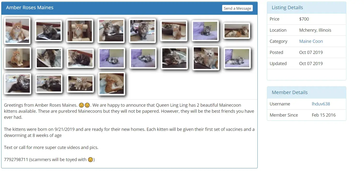 dont get scammed. this person showed us a fake pictures and when we got there tried to sell us a kitten that was not the picture texted. looked like a stray or barn kitten with mange. not kitten promised. google maine coon scams. shocked to see that there is a huge number of scams with people and these cats, we were almost scamedand dont want anyone else to go thru that.