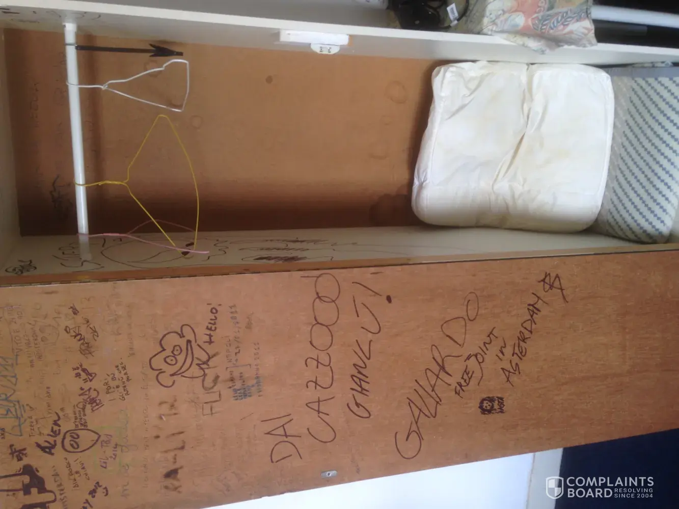 There are dirty sheets on the bed with stains over the blanket. In the room, you need to keep your shoes on its so filthy. As for the wardrobe it is unusable.