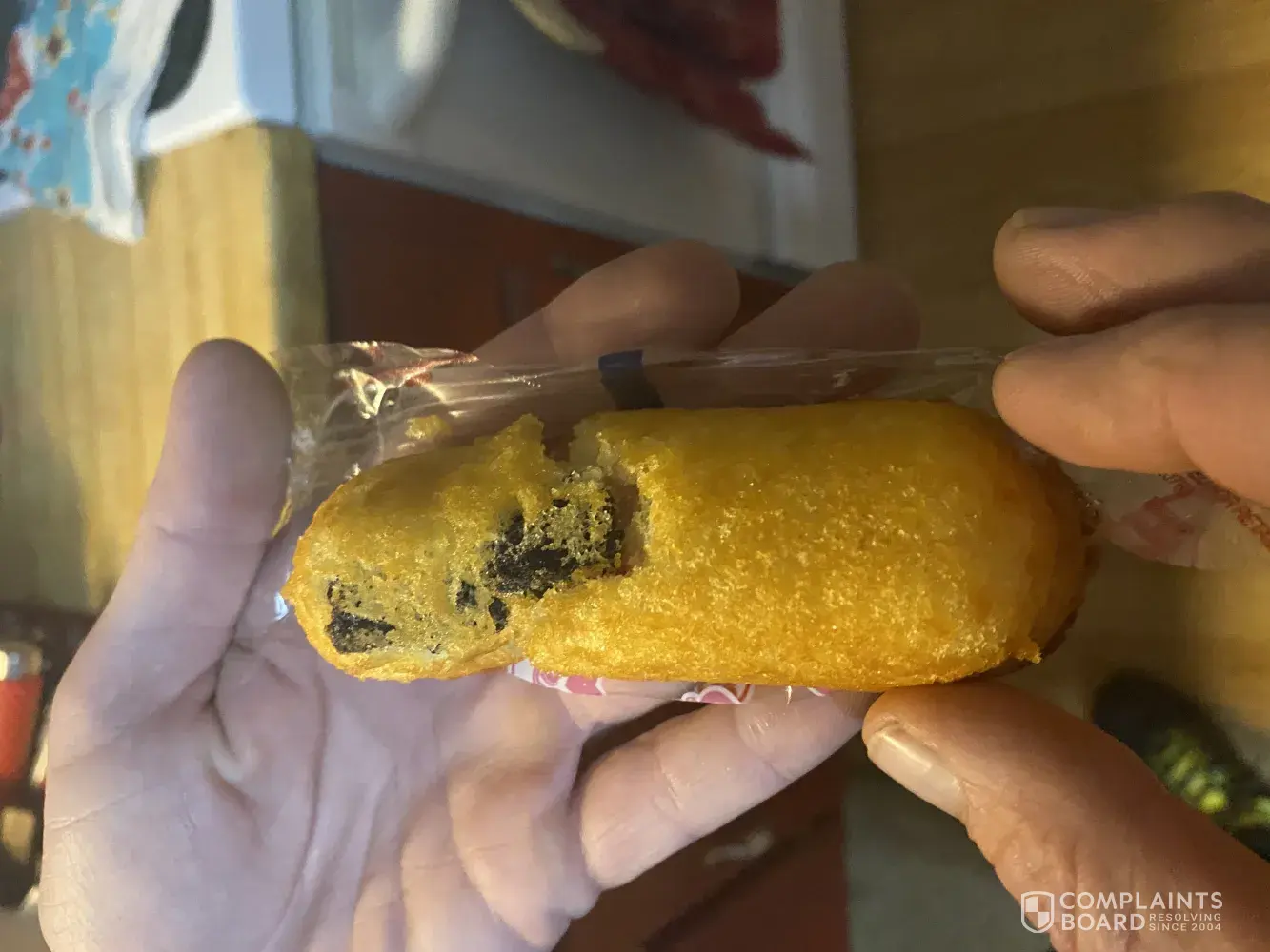We bought a box of strawberry twinkies. In the middle of the night, my boyfriend got out of bed to have a snack. It was dark in the kitchen and when he went to bite down in the Twinkie, there was a hard black object toward the top of the Twinkie that he bit into. He hurt his tooth on it, turned the light on to discover what looks almost like a piece of wood in the Twinkie. I am including pictures. Not at all happy about this mishap.