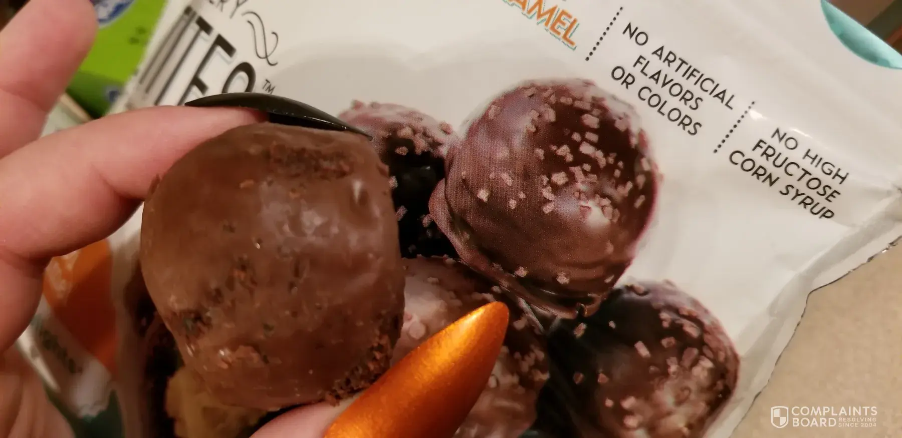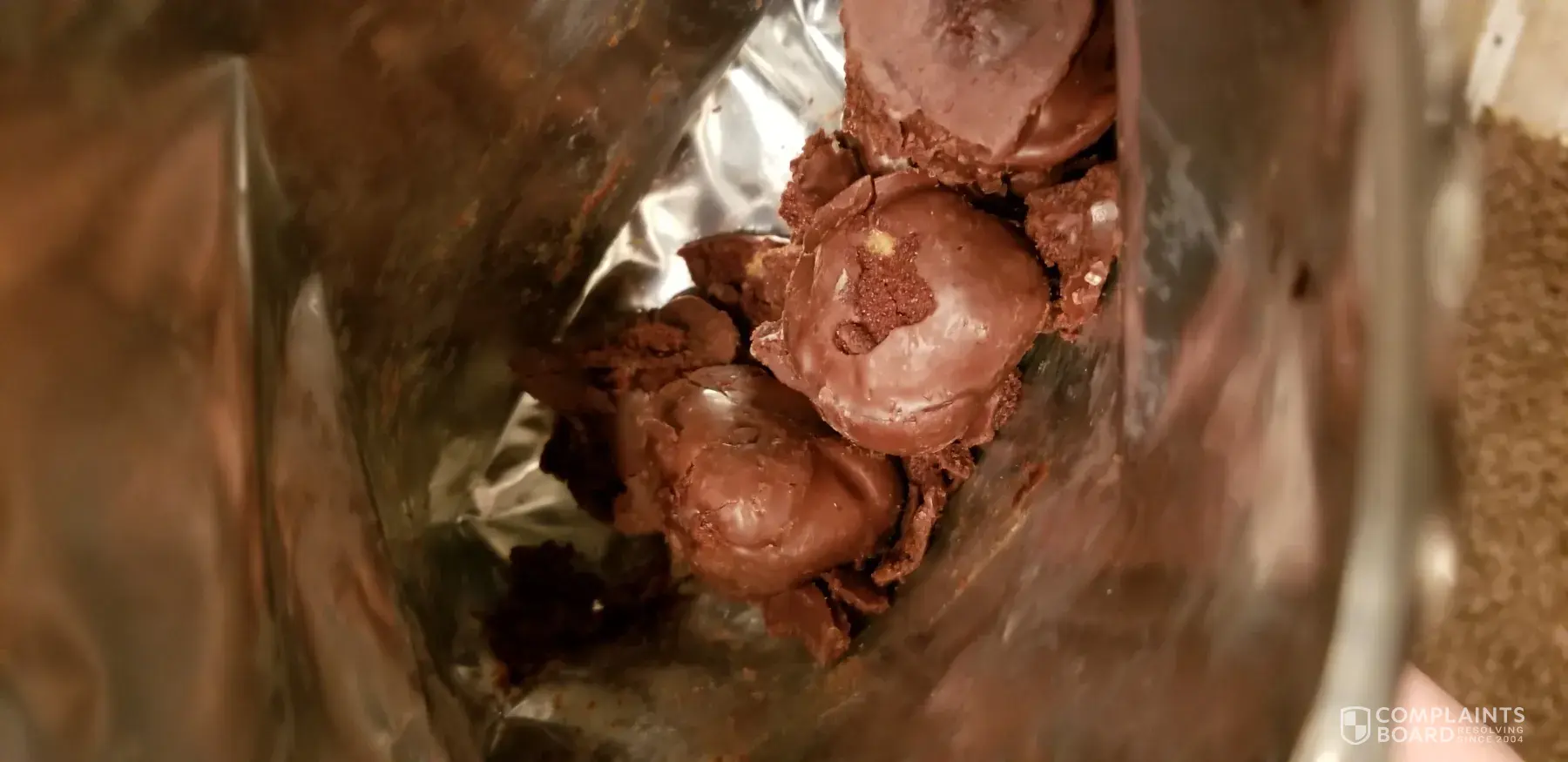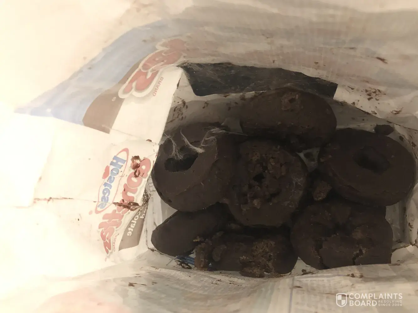 Discovered after I got home, the smashed donettes were covered in chocolate coating, which was not smashed. This is definitely a assemble line problem, really upsets me to pay $4.99 for unacceptable product.