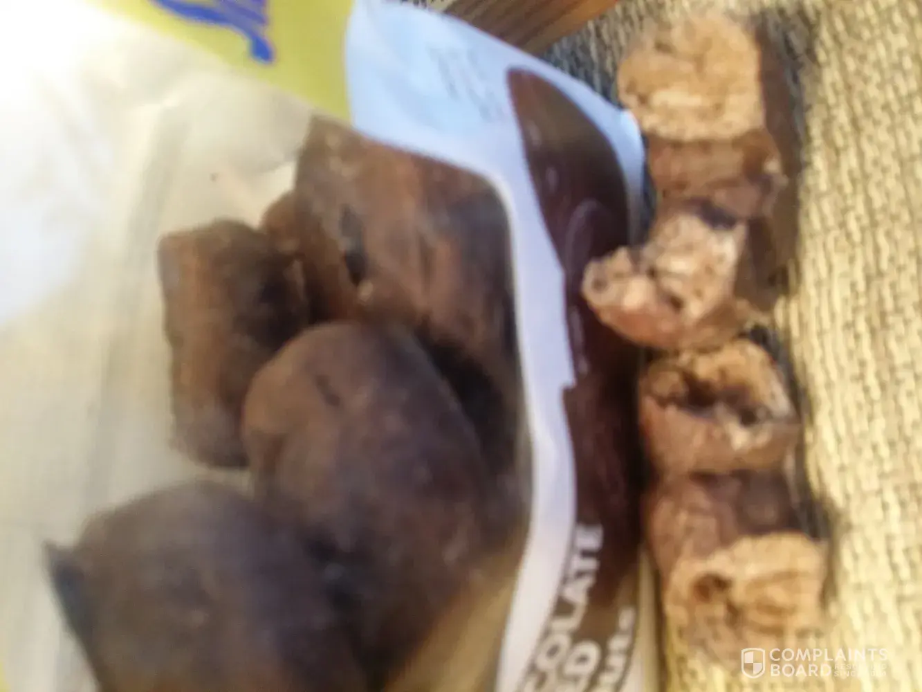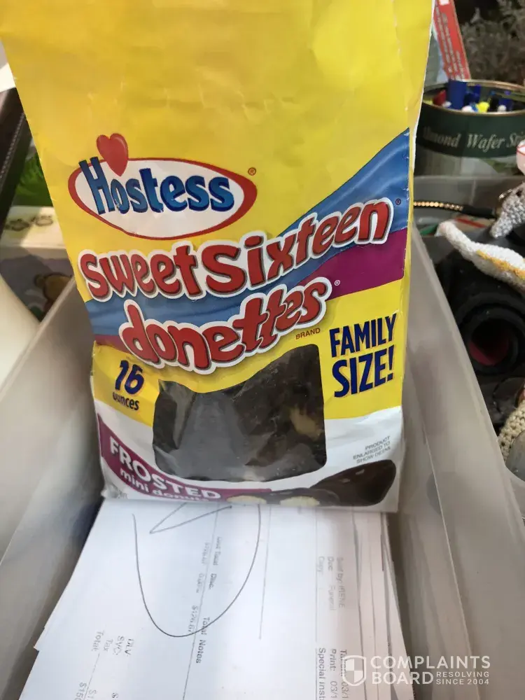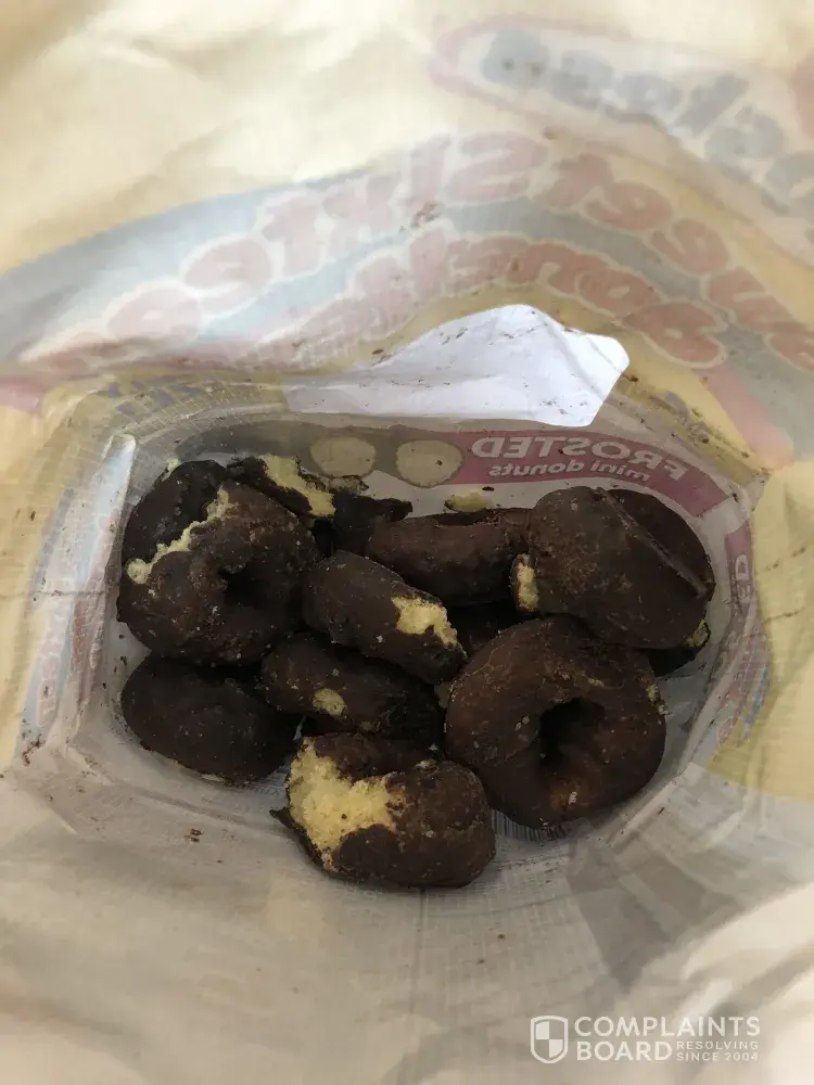 The last several bags of donettes powdered mini donuts must have been at the bottom of the pile when transported. I would estimate that about 7-10 donuts are smashed almost flat or crumbling in pieces. What happened?