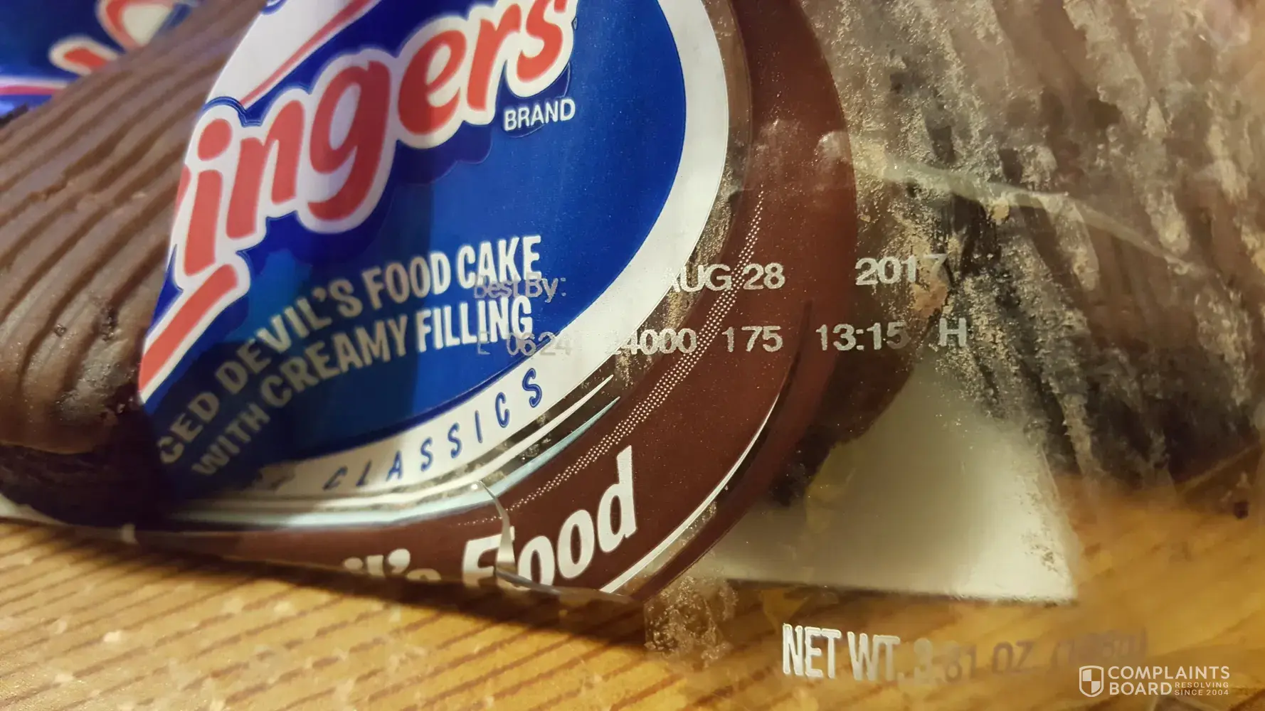 Purchased a pack of the Devil's Food Zingers (product Bar Code [protected]) from Market Basket on 2017-AUG-15, package was sealed, with expiration date of 2017-AUG-28. Product was laced with white mold across the bottom, in such a manner as it was nearly impossible to tell it would be damaged before purchase.