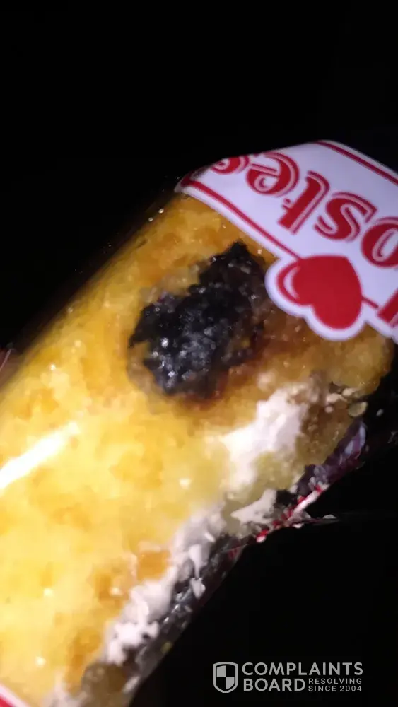 I purchased a box of the Vanilla frosted zingers from my local Woodman's grocer in North Aurora, IL on 2/23/2017. Upon opening it was observed that one of the cake snacks has an object on the side of it that does not appear to be edible. It looks like an insect, though I am not certain. The object is also very hard in texture. I absolutely love the vanilla zingers and this is completely unacceptable. I am always buying 2-3 boxes at a time and though this problem has never occured in the past it is an issue that has made me uncomfortable in proceeding to purchase any more of your product in the future. I am not sure what can be done to resolve this issue other than to prevent it from happening in the future.
