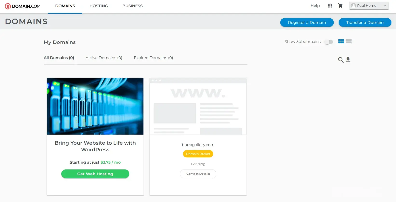On Jan 24 I bought the lapsed domain name on behalf of our volunteer-run art gallery. I would normally buy from an Australian domain/hoster but bought from domain.com for an excessive price of $109.99 $US as the site was hosted in the USA. But I don't own it. It appears to be owned by a broker Dirk Cyr whose email address on domain.com goes nowhere