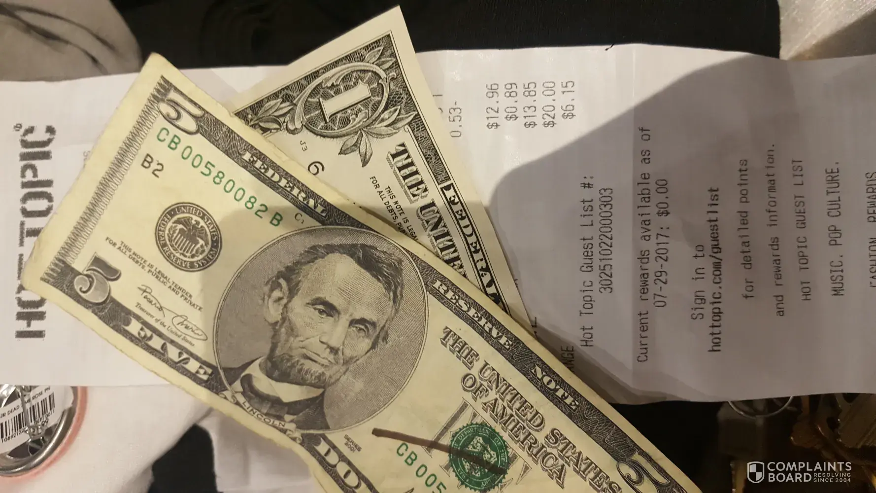 On 7/29/17, I purchased three shirts for my daughter and paid by debit card ($49.80). My daughter came up and wanted to buy six buttons and a choker. I paid for these items with a $20 bill. The total was $13.85, so I received $6.15 back in change. We left the mall and I went to a another store and I attempted to use the $5 I had received from Hot Topic, but was told it was "fake". (the $5 bill and $1 bill were folded within the receipt from Hot Topic.)