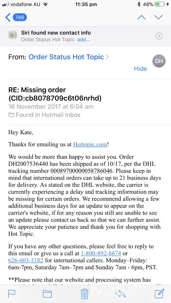 I contacted Hot Topic on the 15 November and was told to wait longer.
