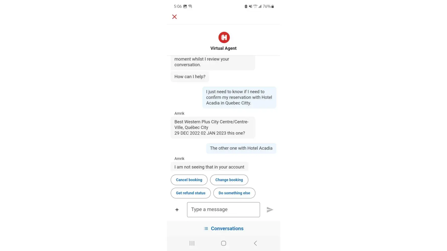 I had booked Hotel Acadia back in august 2022 in which we had accommodation for Dec 28-22-Jan-2-23 (Itinerary: [protected]). On Dec 27th I spoke with a representative using the online chat option on the Hotels.com phone app. I received confirmation that the reservation at Hotel Acadia in Quebec City was “intact†and did not need to confirm anything...