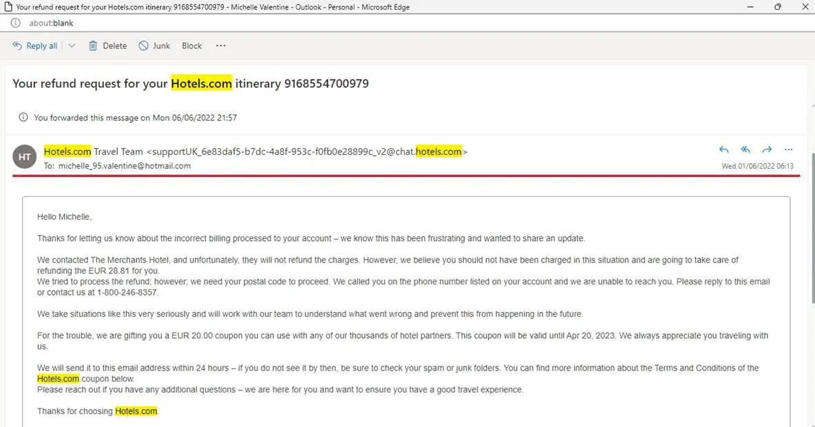 I am complaining due to the service I am currently receiving following a refund I am still waiting on. I have been getting emails from Hotels.com with a fake number to call back to process a refund. however, when I try to request this through the online chat, the agents I speak to advise me to wait further days for a refund to be processed. I have been advised by recent emails to send over relevant information, such as my post code and the date the payment was taken from my account and as such I have, I provided this information. but have not had any correspondence accept to call back on the following number: [protected] this number is unrecognisable it looks like an international number to me and won't let me dial out. I requested via email for an agent to call me back directly instead. and I am still not hearing anything but repeated emails stating ' Hello Michelle,