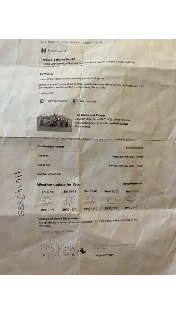 We arrived at the Globe and Crown in Yeovil on 27th May only to find that the hotel had been closed for some time. So we were left stranded on the holiday we had been looking forward too. I could not get any answer from the telephone number provided being +[protected] and have also been unable to contact any non-virtual representative at Hotels.com. When I type in my booking reference number being: [protected] your virtual help tells me this number can not be traced yet I have it all printed out on paper which I took with me.