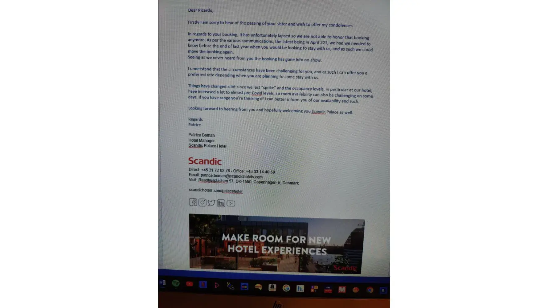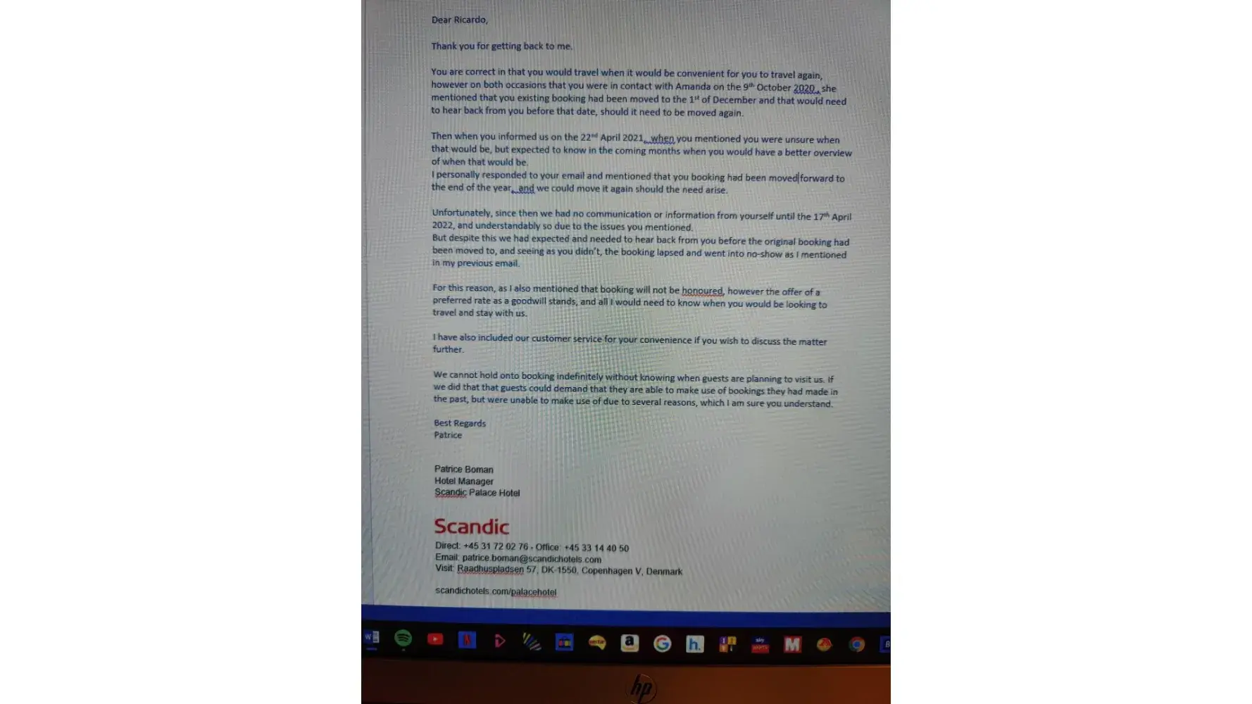 We booked 4 nights with Scandic Hotel in Copenhagen and then Pandemic / Covid started so we could not travel as Denmark before Britain went into a lockdown. These restrictions were in place... when these rstrictions relaxed, we wanted to book but the restrictions kept getting tighter again... not fault of my own.. we all have our own lives and plans...my sister in law passed away with cancer a couple months ago...so this has put also a strain when we were available to spend the well deserved break in Copenhagen... When contacting the Hotel, they have now turned around that long time have passed and they no longer honour the booking..?