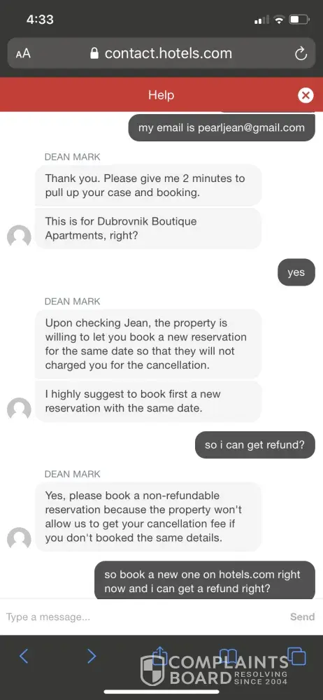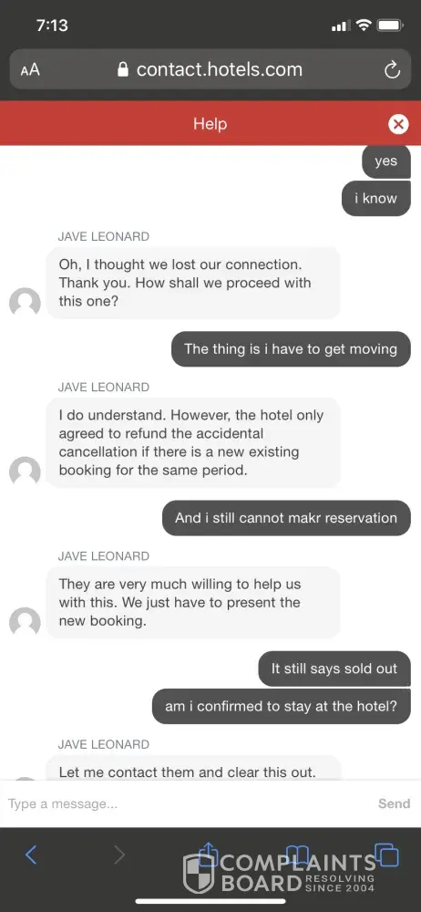 I made a reservation through hotels.com hotel and it got accidentally canceled. I chatted with several agents over this issue and said no problem checking in and told me I can get a refund for it if I make another exact same reservation on hotels.com. And I got a confirmation email from the hotel and then when I rechatted regarding this, agent said I need to wait for few hours to make another reservation for the same dates and this another reservation did not work even though I kept watching and trying to make reservation on the site.