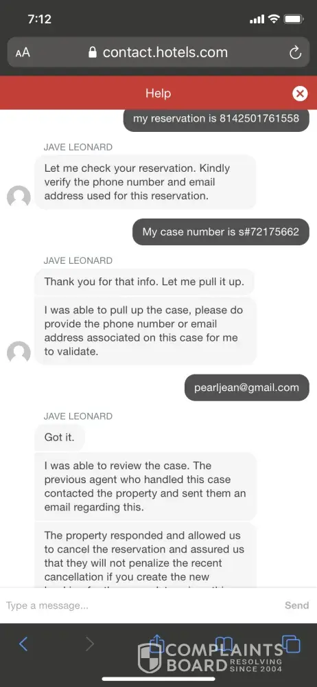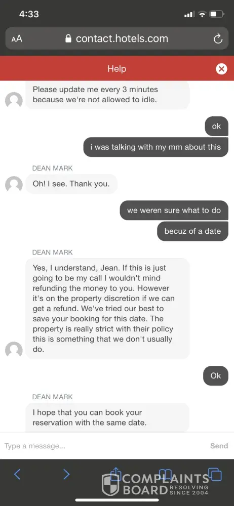 10/9: I spoke with Carl. He assured me he sent a request for a refund to the hotel and gave me a case # of [protected]. I explained my reason for cancelling as 35 counties in California were being warned by PG&E that power would be shut off due to fire dangers. I explained that I wasn't comfortable moving forward with the reservation due to the fire dangers facing California at that point and was trying to cancel the 4 dates and get a refund of over $800. I told him that if a refund wasn't possible, could I change my dates. I'm not sure what was included in his email to the hotel. He told me I should have an answer in 24-48 hours. I heard nothing. So, on 10/12/19 I called and spoke to Liam. He had zero record of my conversation with Carl, no case #. He was very difficult to understand due to his accent, but told me I should hear back in 24 hrs. I heard nothing. On 10/14/19 I called for the third time. I spoke with Josephine. She said she would make the request urgent and would only ask for a cancellation refund. On 10/16/19 I received an email from Hotels.com: