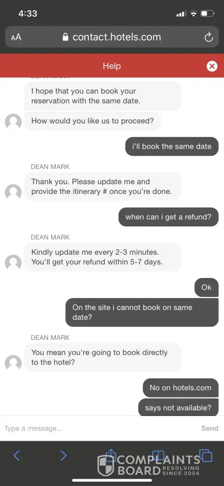 I have been trying to get a refund from this company for the last 4 to 5 weeks. The refund has been approved however they keep sending me an email saying there's a processing error. I keep calling Hotels.com to try and rectify this and they always tell me the correct person to Talk to is currently not in and someone will call me back. I have spent six hours on the phone and no call back so far.