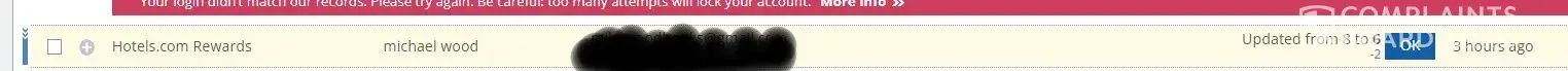 I wanted to change my email address from msn to gmail; all my personal information was the same; as soon as I changed my email my rewards activity restarted to the day of changeing my email resulting in my losing my previous hotel rewards even though my account personal info. hadn't changed. Unabel to talk to a human or even contact hotels.com by email. Must be one person running the company.