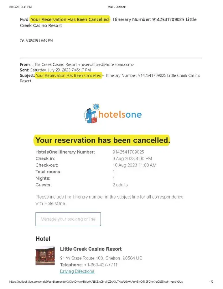 We made a reservation on July 29,2023 at Little Creek Hotel and Casino in Shelton WA. After we made the reservation we realized it was not made through the Hotel, because they would not honor our complimentary stay. We immediately cancelled the reservation with and received a cancellation confirmation email. However, they did not refund the payment and did not notify the hotel that reservation was cancelled. So we paid $233.57 for a room we did not sleep in. When we called Expedia, we were transferred to many offices (all overseas) and they kept saying the could not help. The fact that Expedia claims to be this great company, and honor cancellations is a joke. We are out $233,57 dollars because they have a website setup that "looks" like the hotels, but in fact it is not. And after we drove to the hotel and talked the manager, she new about the problem and was sorry we were tricked. We cancelled the reservation on the same day, and the confirmation is attached.