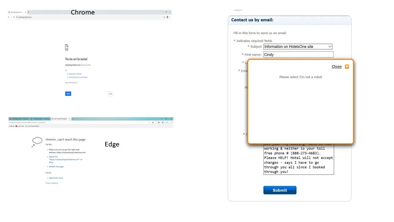 I then try the Contact Us link, which takes you to an online form to fill out. I complete the form, providing all requested info. When I hit "SUBMIT", I receive a pop-up message that says to "Please select I'm not a robot", but there is nothing to select ... it's blank.