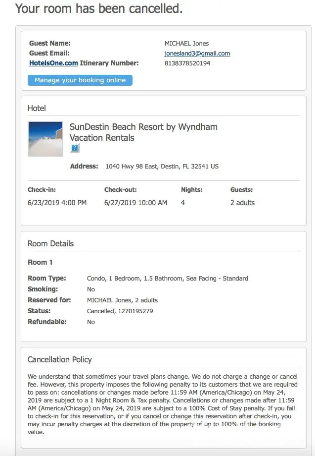 I made a reservation with Hotelsone.com, for a destination in Destin Florida.